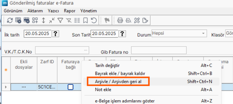Bu sayede ilgili belgeler arşivlenebilir veya arşivden geri alınabilir. Ayrıca gönderilmiş faturalar ekranının üst sekmesinde bulunan "Klasör" kısmından Arşiv klasörü seçildiğinde arşivlenen ilgili faturalar görüntülenebilir ve arşivden geri alınabilir.